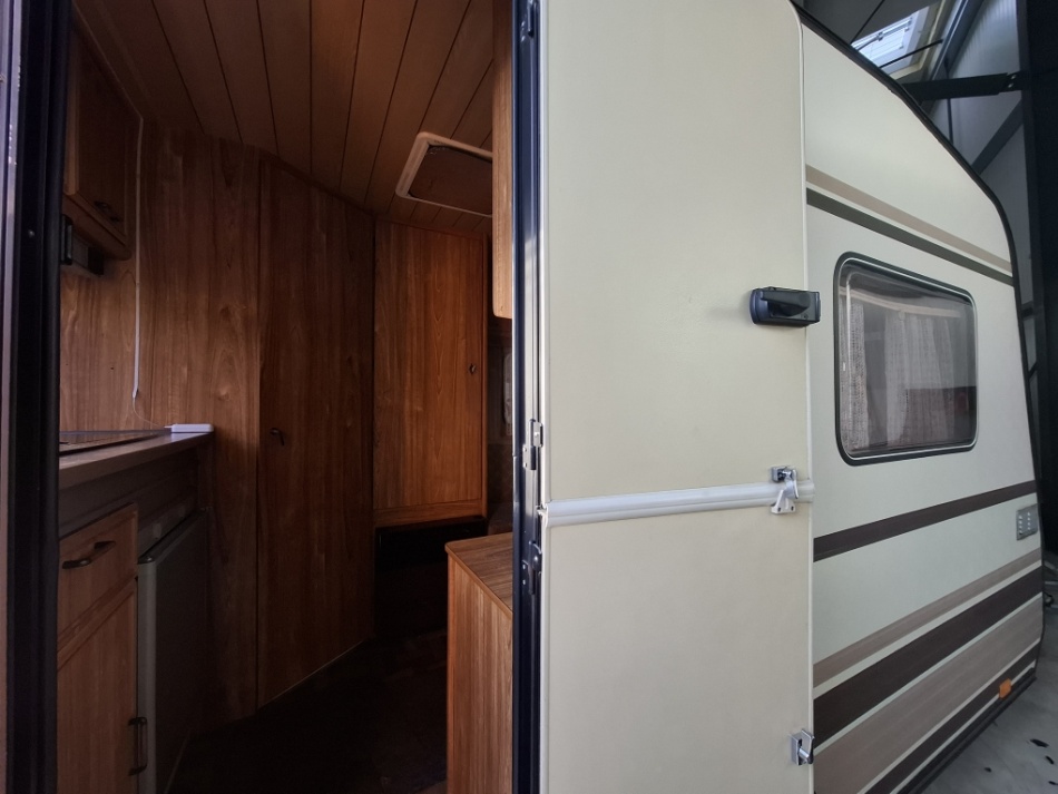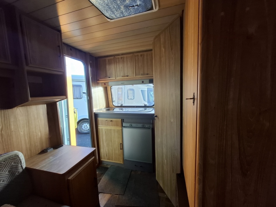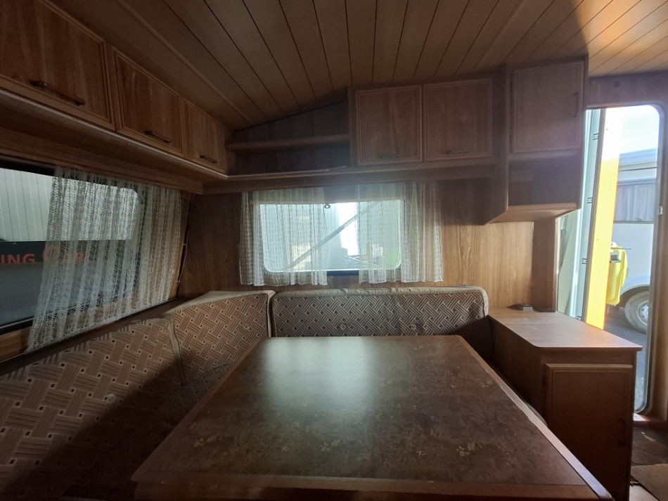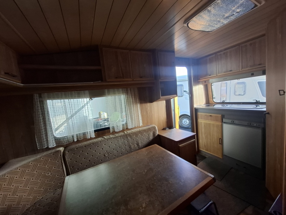 Lit double massif avec fond de lattes et joli matelas, siège de train avec table à manger pour construire un lit double, cuisine avec plaque de cuisine séparée, évier et réfrigérateur, placard haut avec étagères, espace placard autour et grand rangement sous les canapés.