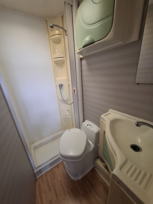 salle de bain à l’arrière gauche, propose une douche séparée, un lavabo et des w.c. cassette.